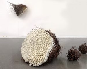 Die zahlreichen kleinen Porzellan-Klanghörner reagieren auf Schwingung, Bewegung und Berührung des Taumelkrauts und erzeugen dadurch unregelmäßiges Rauschen und Dröhnen. Klänge wie fragmentarische Erinnerungen oder flüchtige Gedanken.