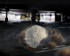 Inspiriert von der vertrockneten, windverwehten Pflanze „Tumbleweed oder Taumelkraut“ und deren Strategie ihrer Verbreitung, werden hier zahlreiche Kabelstränge aus ihrer alten Funktionen gerissen und zu einem Knäuel geformt. Aus den hauptsächlich passiven Kabelverbindungen ergeben sich dadurch auch zufällige, neu zusammengefügte Kontakte.
